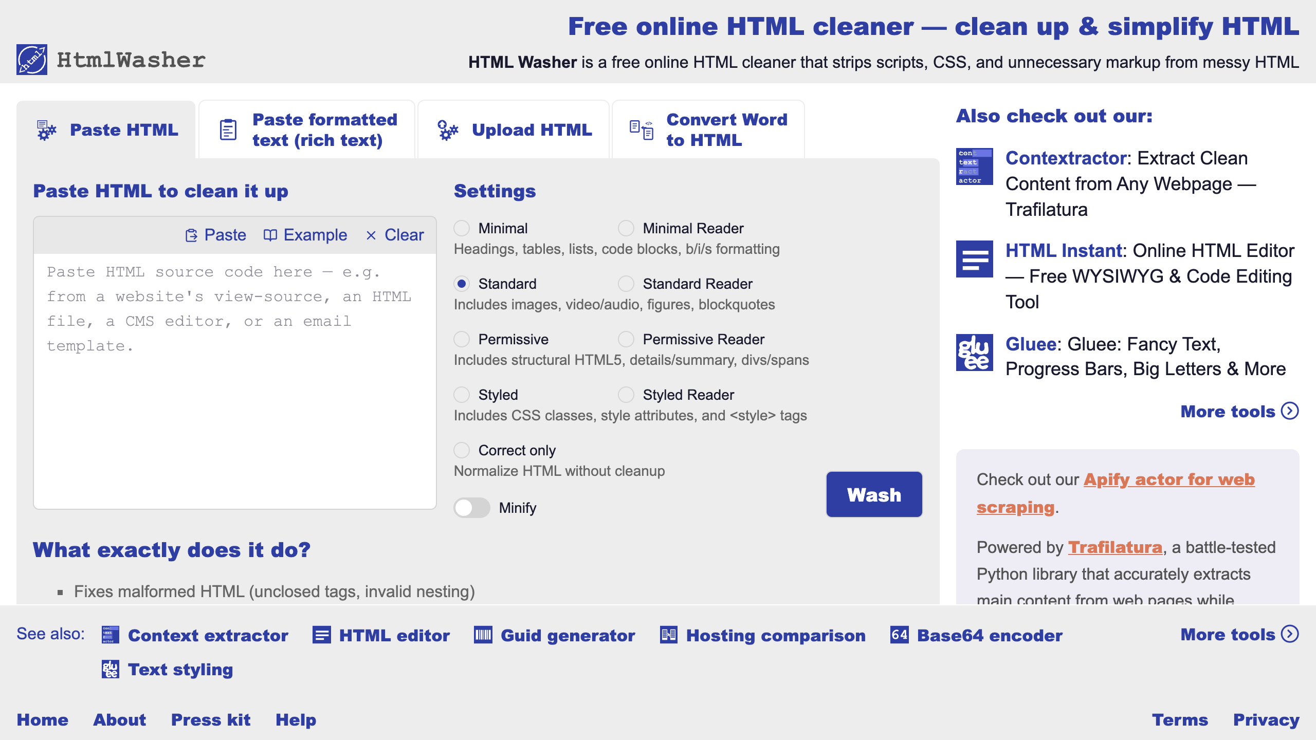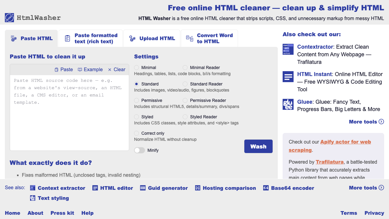 HTML Washer is a free online HTML cleaner that strips scripts, CSS, and unnecessary markup from messy HTML